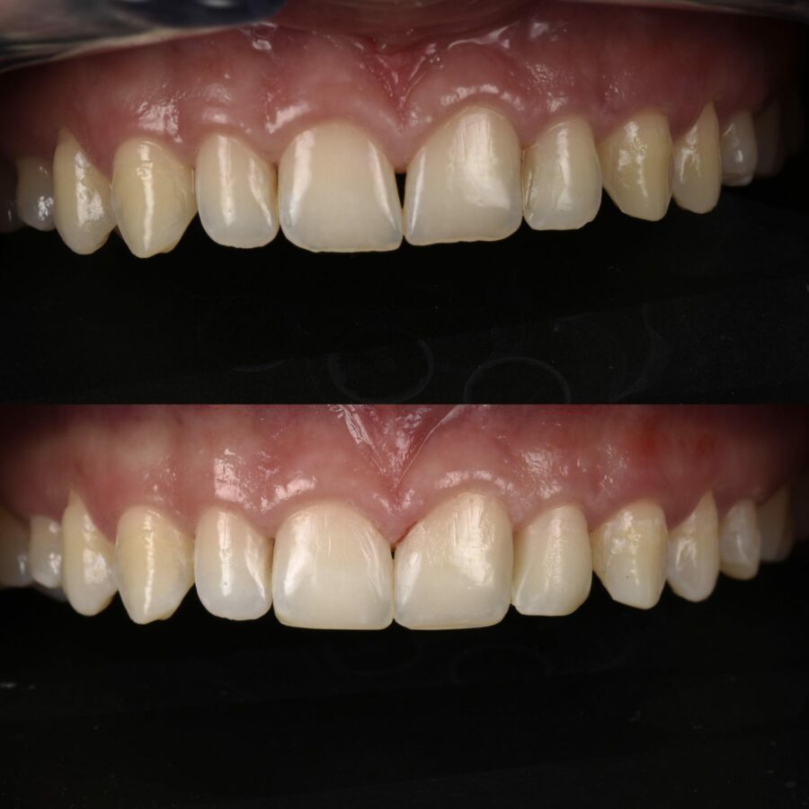 Mellomrommet mellom fortennene er her lukket med ved å lime på forme fylling uten å bore i frisk tannsubstans først.